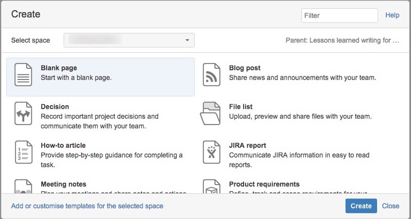 While you can’t always expect some team members to use page templates, I commend Atlassian for making their templates easy to use. I’ve gotten users up and running on Confluence templates using just a few clicks.