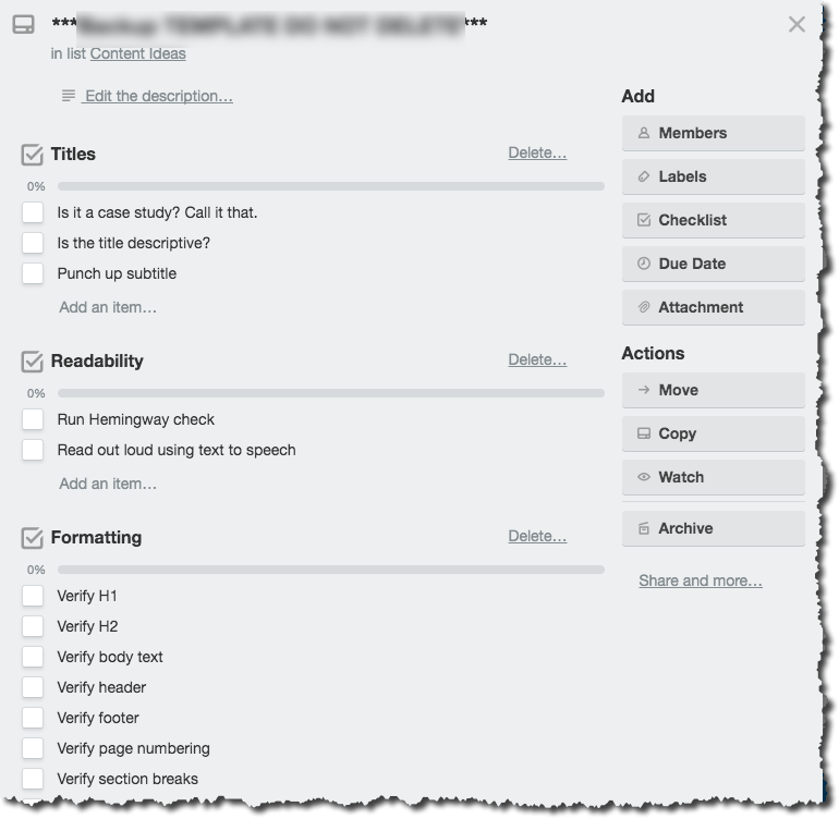 - Create a card template (conveniently stashed in the Backlog column) that I use the checklists feature to map out an editing checklist I groom govern editorial quality and style. I also use the checklist to help remedy any of my usual writing mistakes.