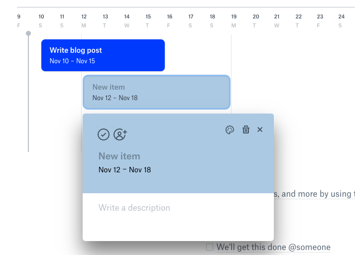 Below the interactive Project Plan, the template includes an area where you can put more project details by inserting Dropbox files, media, tables, another timeline, and lists. There’s also a to-dos list where you can @ team members to let them know what tasks you assigned to them.