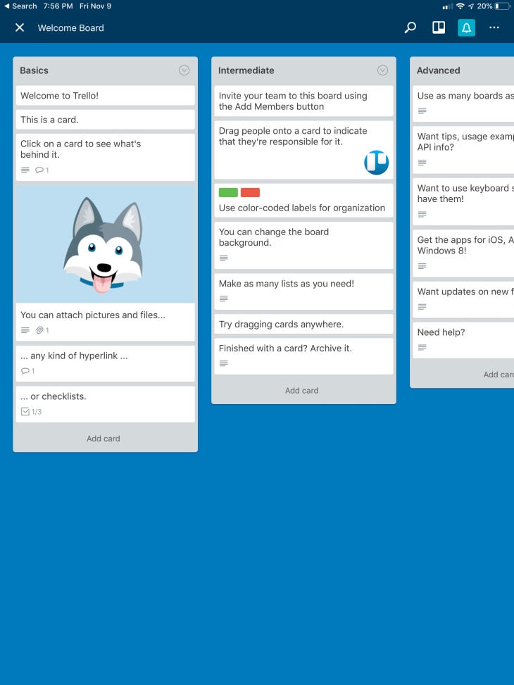 There’ve been points in my career when I’ve been managing loads of smaller projects that stop and start — articles, blog posts, and smaller documents — so I came to Trello because it lets me create and manage workflow. I can also leave notes to myself as to why a project got blocked, or I had to stop working on it.